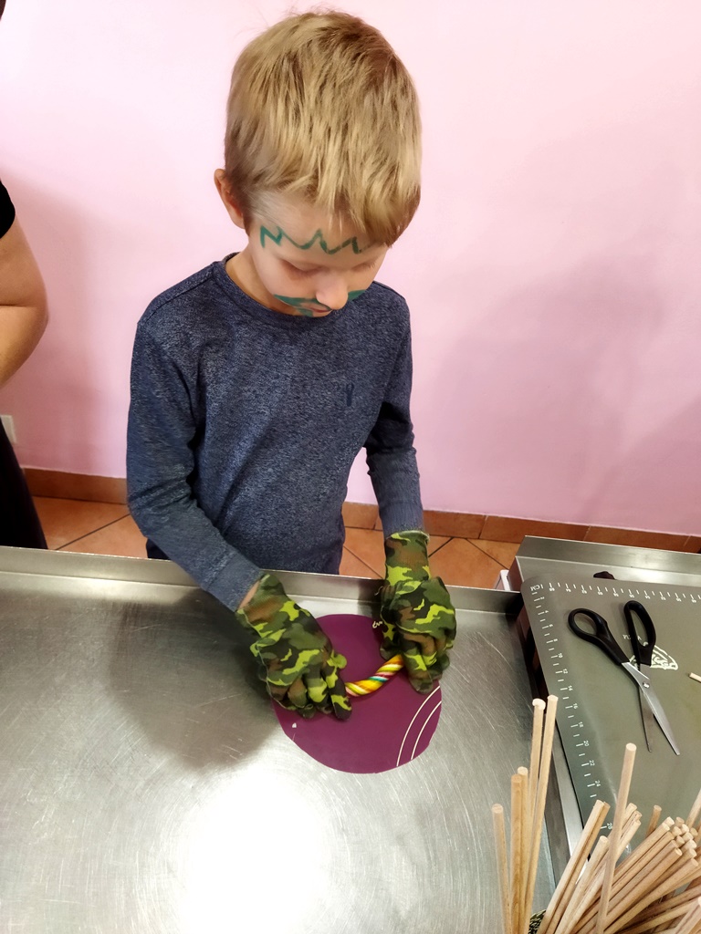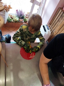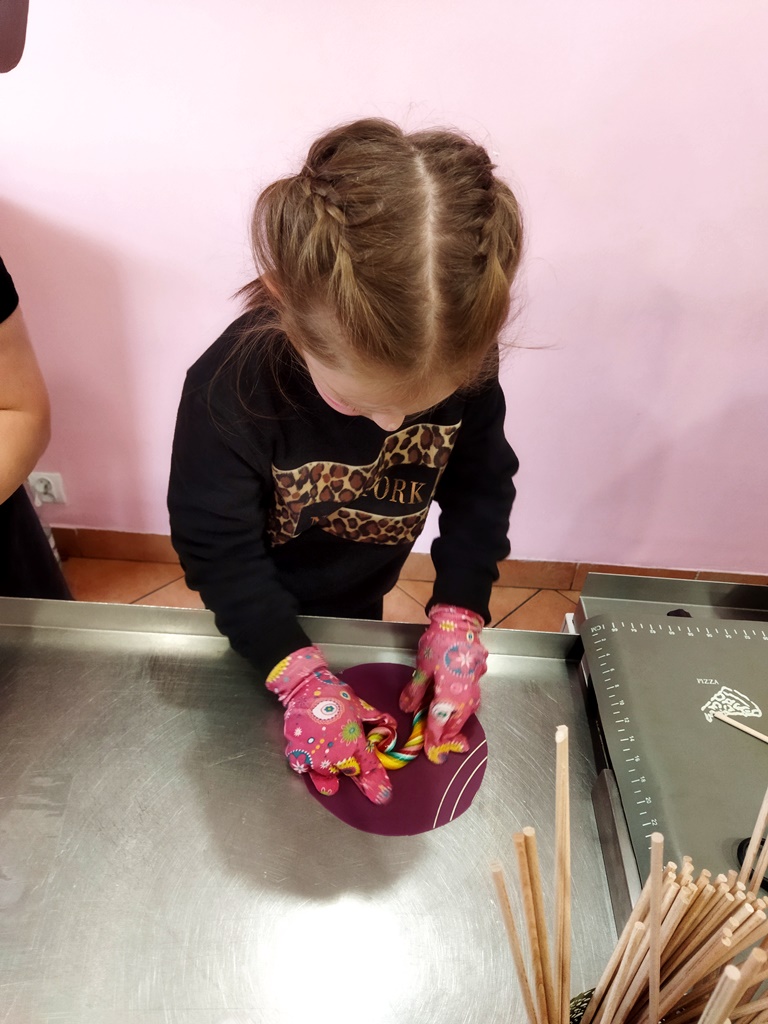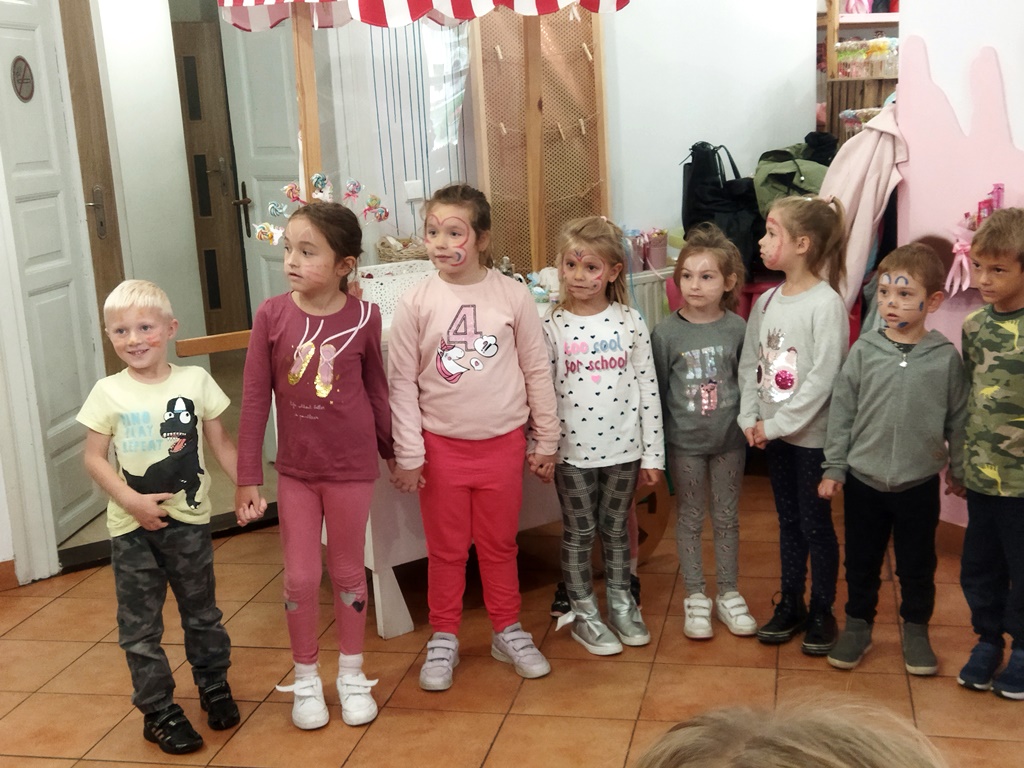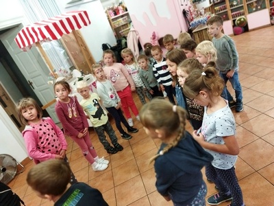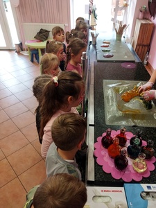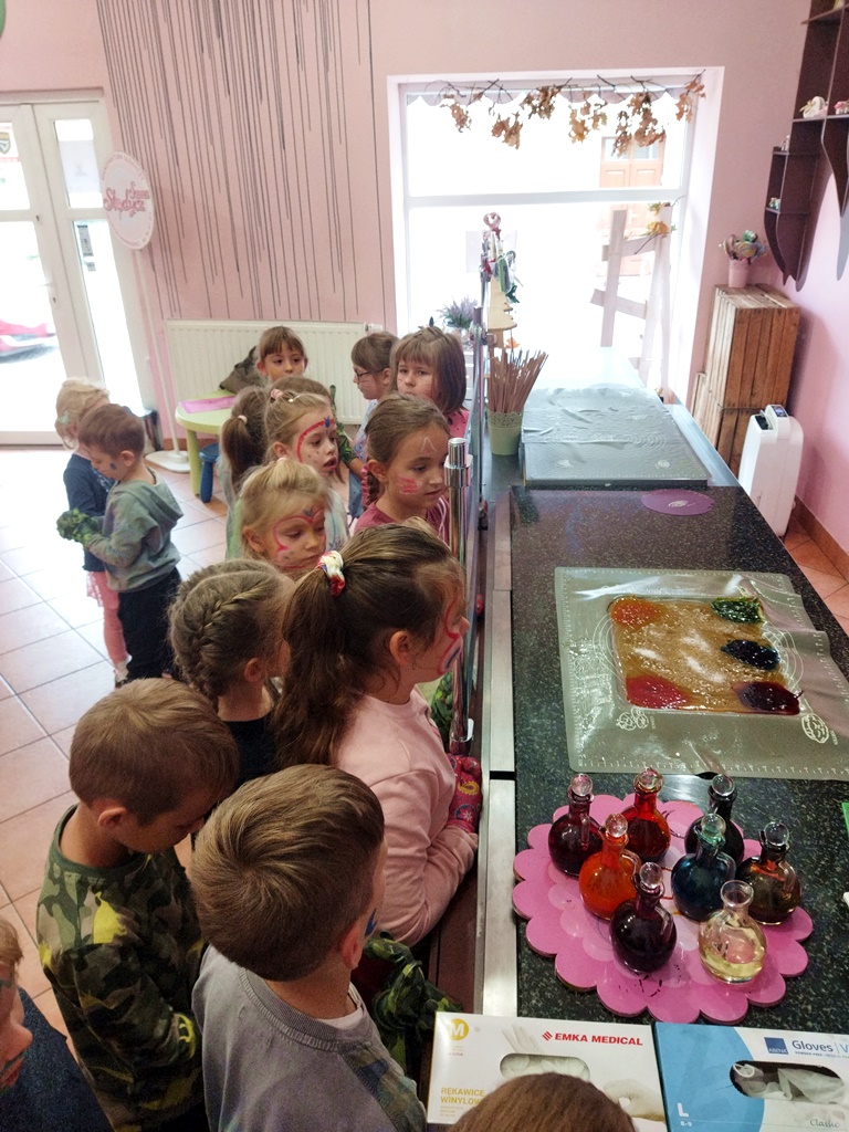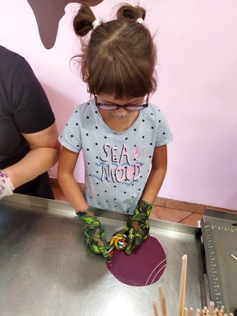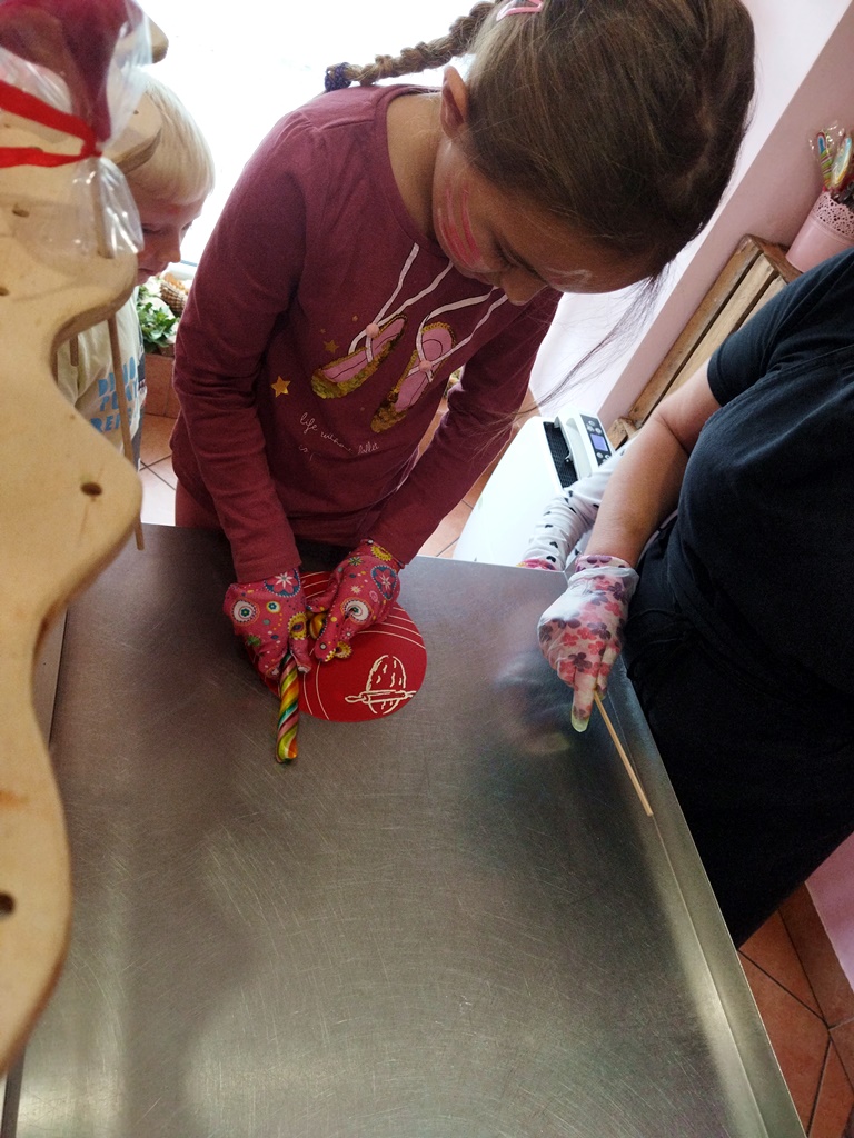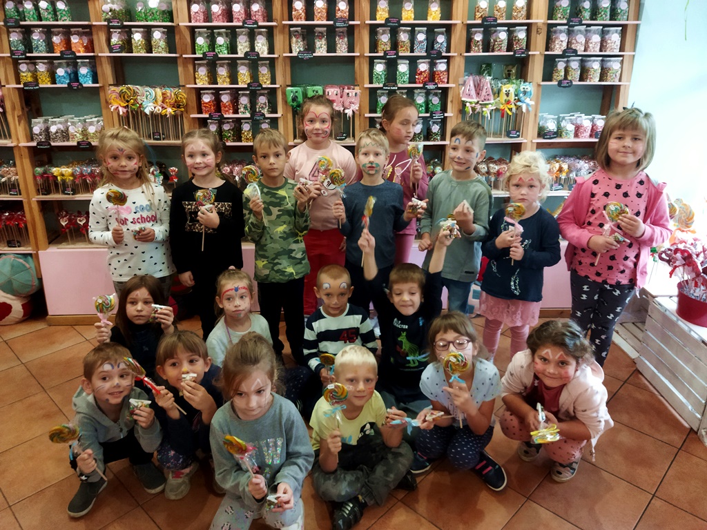 Aby osłodzić ostatnie dni lata i świętować Ogólnopolski Dzień Przedszkolaka dzieci z najstarszej grupy wybrały się do Manufaktury słodyczy „Sama słodycz ”. Mogły tam uczestniczyć w pokazie ręcznego tworzenia małych, kolorowych i słodkich arcydzieł. Przedszkolaki miały okazję zobaczyć niezwykły proces produkcji słodkości od momentu wylania cukru na stół po stworzenie pięknych lizaków i cukierków. Starszaki obserwowały prawdziwe czary, a co najważniejsze przekonały się, że same potrafią czarować. Po wypowiedzeniu zaklęcia: „czary mary, niech się cukier stanie biały” okazało się, że żółta masa stała się białą. Do masy cukrowej były dodawane różne kolory, między innymi czerwony sok z buraków, pomarańczowy sok z marchewki oraz żółty barwnik którym była kurkuma. Każde dziecko wykonało także własnego lizaka. Przedszkolaki otrzymały słodkie prezenty, które zabrały do swoich domów. Celem wycieczki było wzbogacanie przeżyć dzieci, rozwijanie ich zainteresowań i zaspokajanie dziecięcej ciekawości.