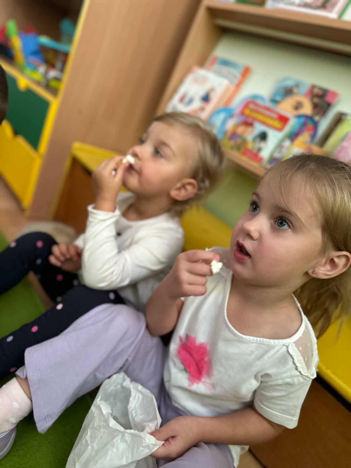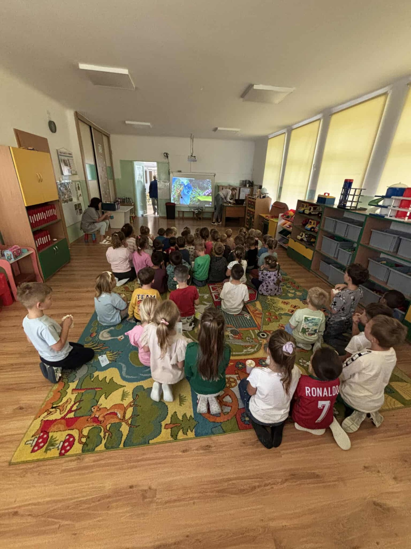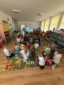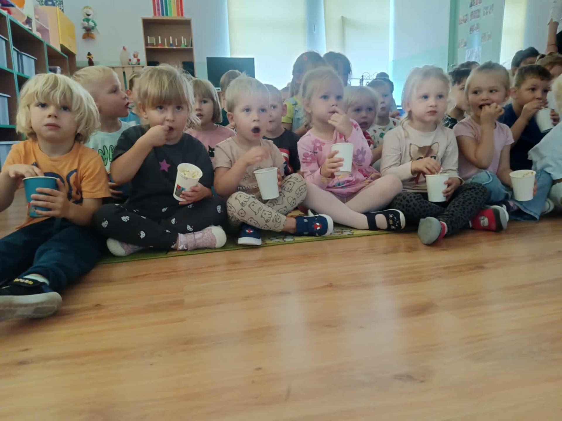 Największą atrakcją okazał się „kinowy seans”. Sala zamieniła się w małe kino, a dzieci z uśmiechem zajmowały swoje miejsca, trzymając w rączkach kubeczki pełne chrupiącego popcornu. Wspólne oglądanie ulubionej bajki sprawiło im ogromną radość i pozwoliło na chwilę przenieść się w świat bohaterów.