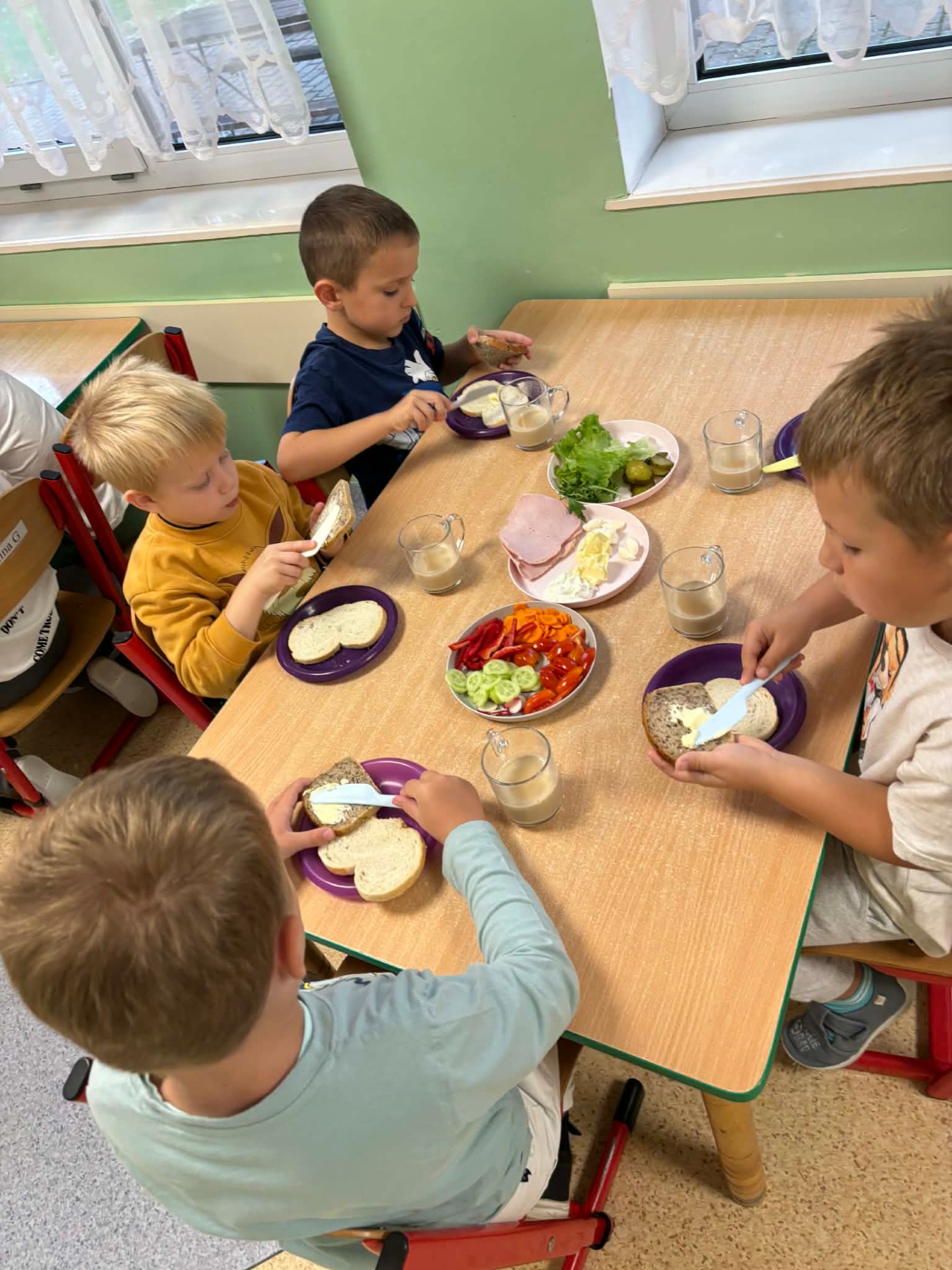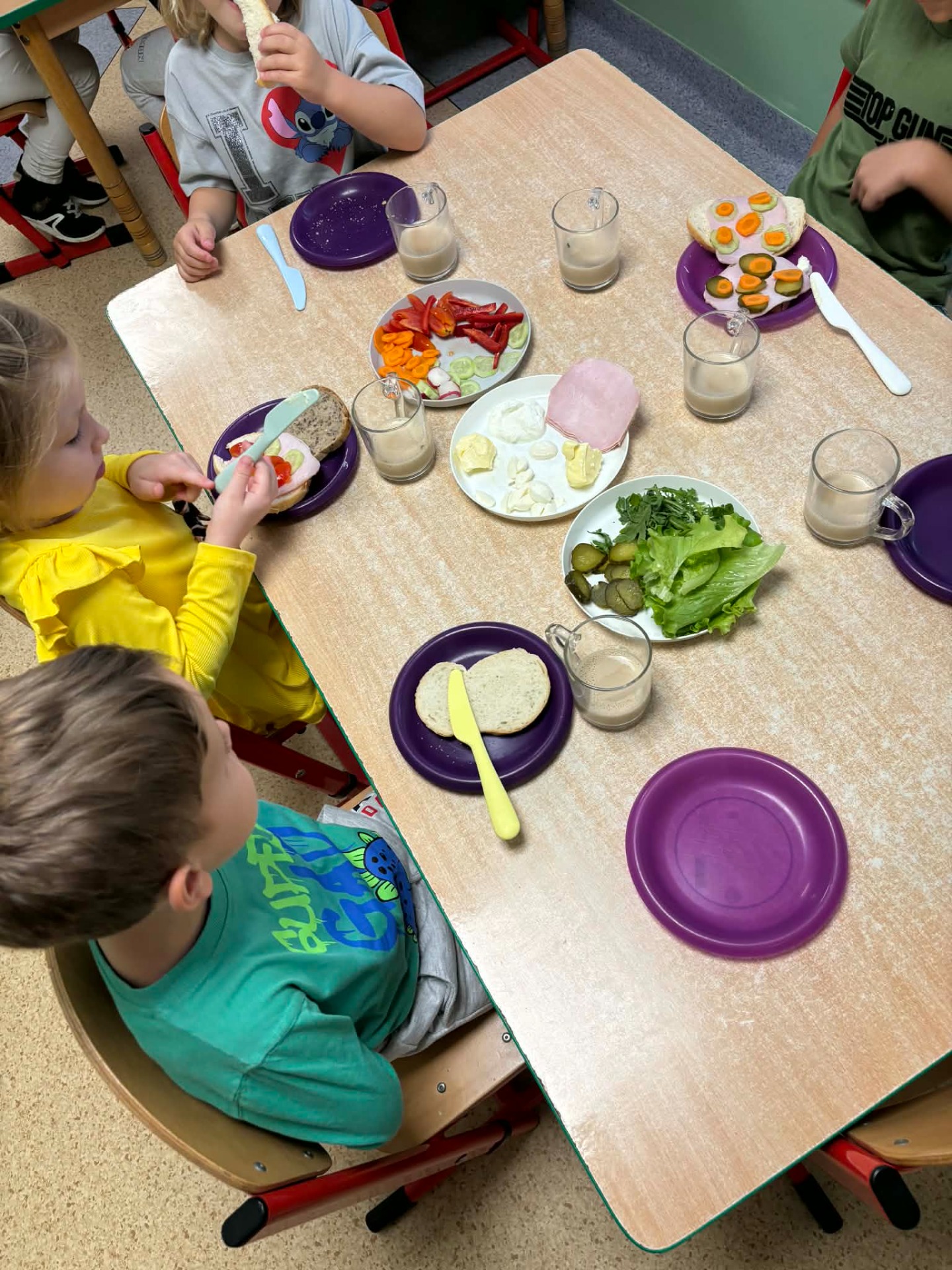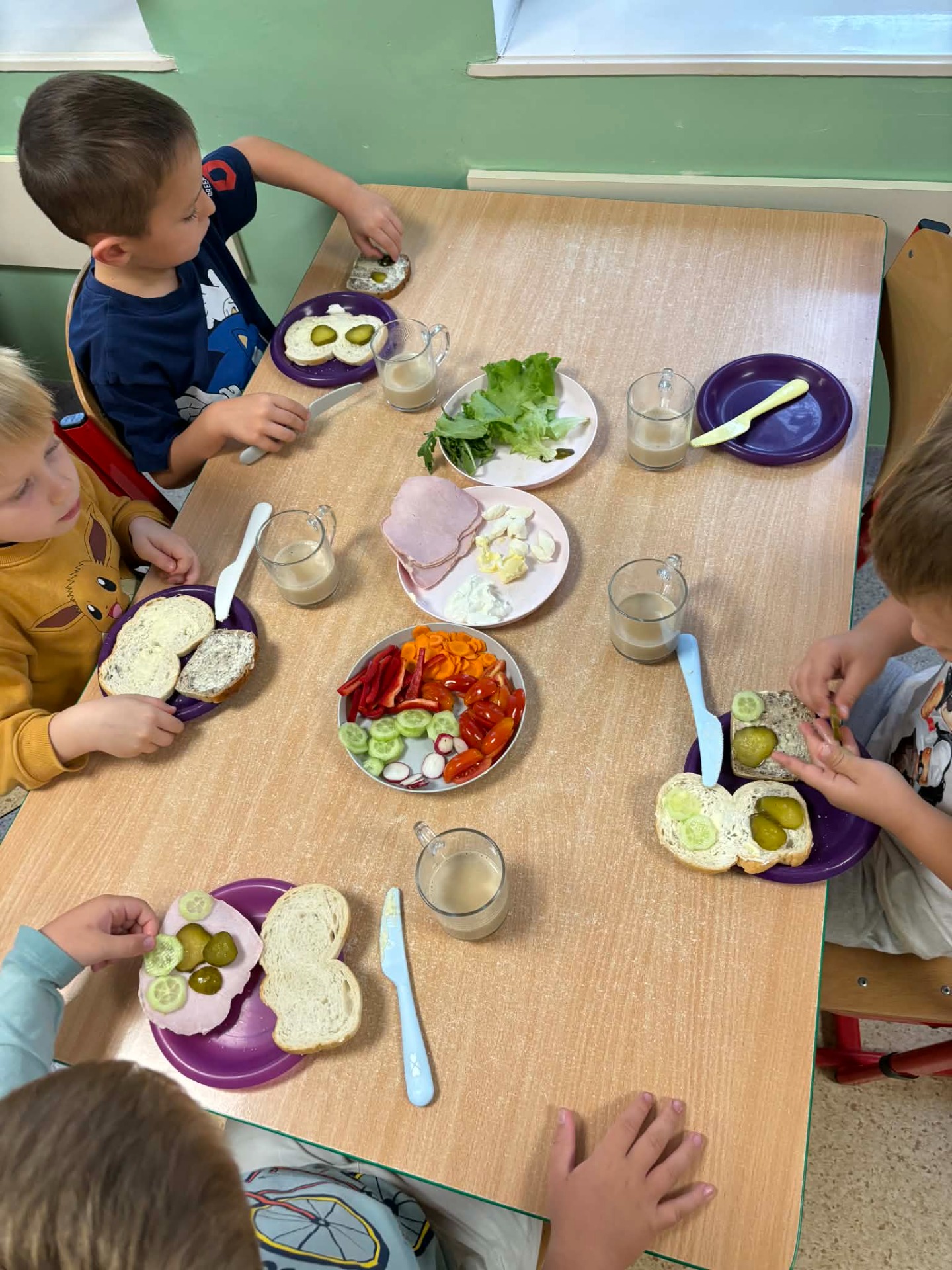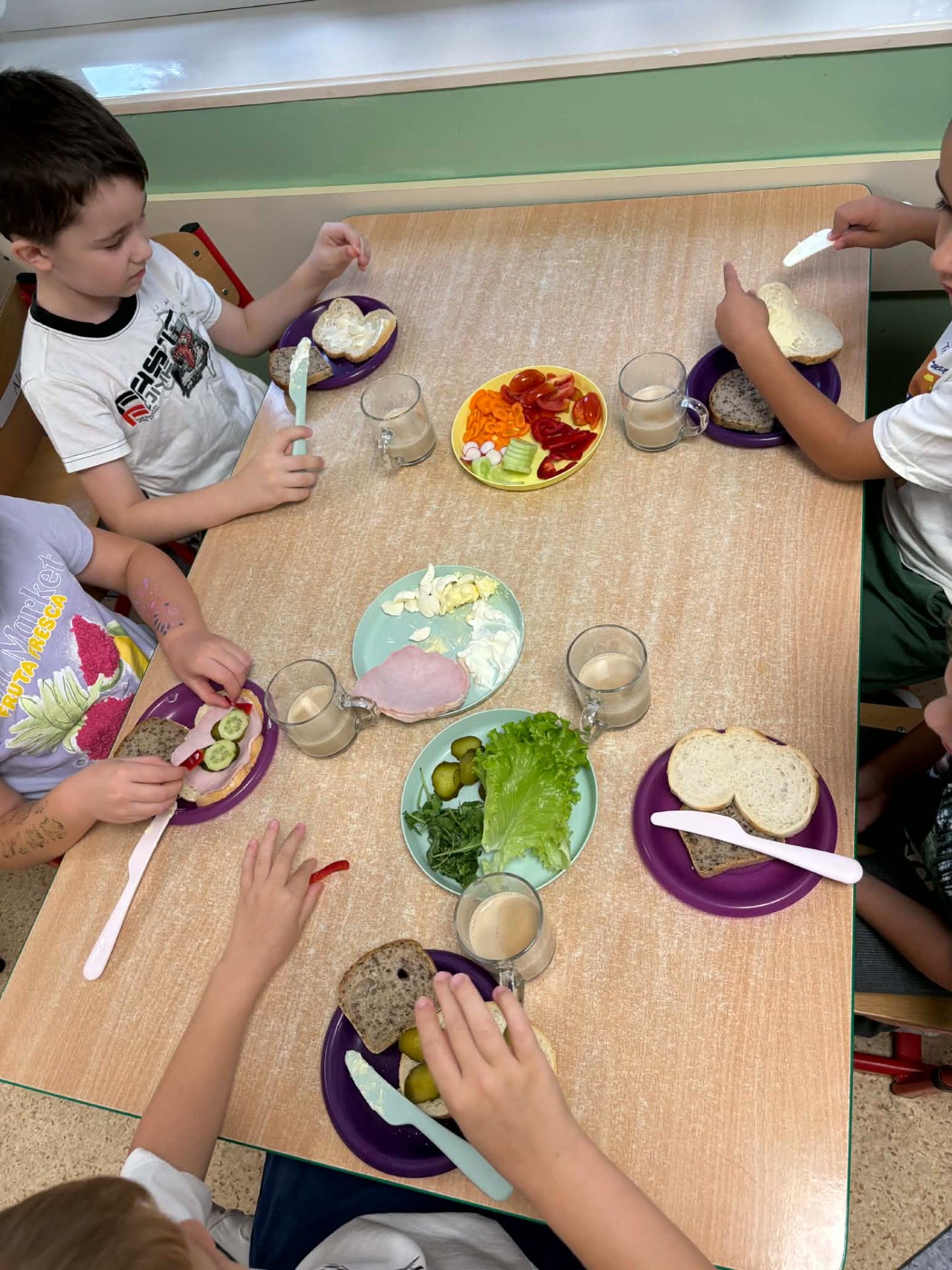Dzieci z grupy Motyli przygotowywały własne, kolorowe kanapki. Samodzielnie wybierały składniki, uczyły się bezpiecznego korzystania z narzędzi kuchennych oraz rozwijały swoje umiejętności kulinarne. Była to doskonała okazja do ćwiczenia samodzielności, kreatywności i współpracy, a efektem były pyszne, zdrowe kanapki oraz dużo radości.