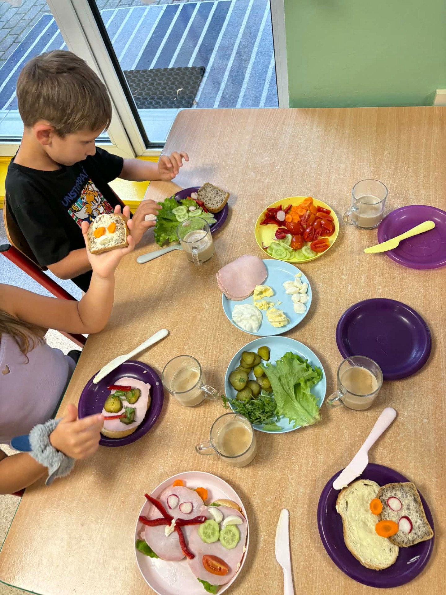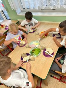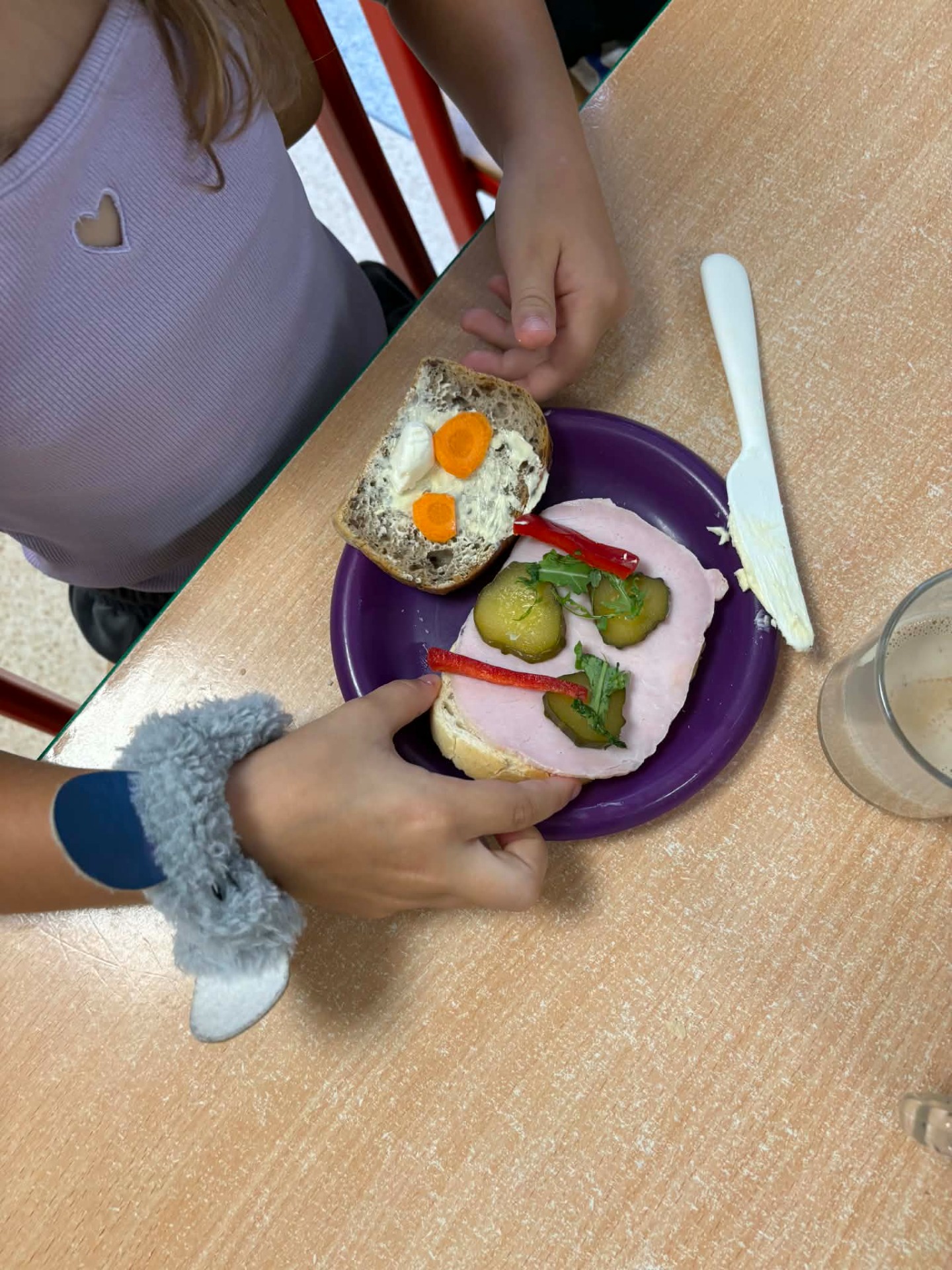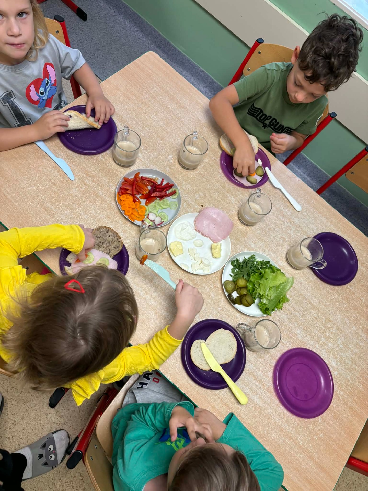 Dzieci z grupy Motyli przygotowywały własne, kolorowe kanapki. Samodzielnie wybierały składniki, uczyły się bezpiecznego korzystania z narzędzi kuchennych oraz rozwijały swoje umiejętności kulinarne. Była to doskonała okazja do ćwiczenia samodzielności, kreatywności i współpracy, a efektem były pyszne, zdrowe kanapki oraz dużo radości.