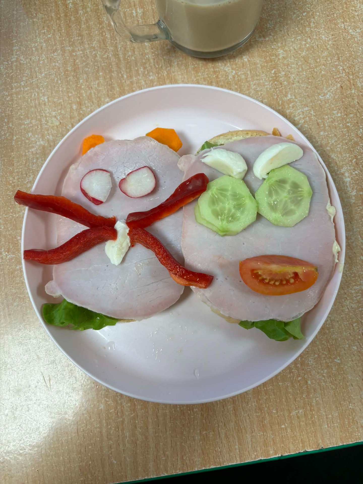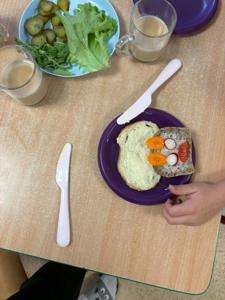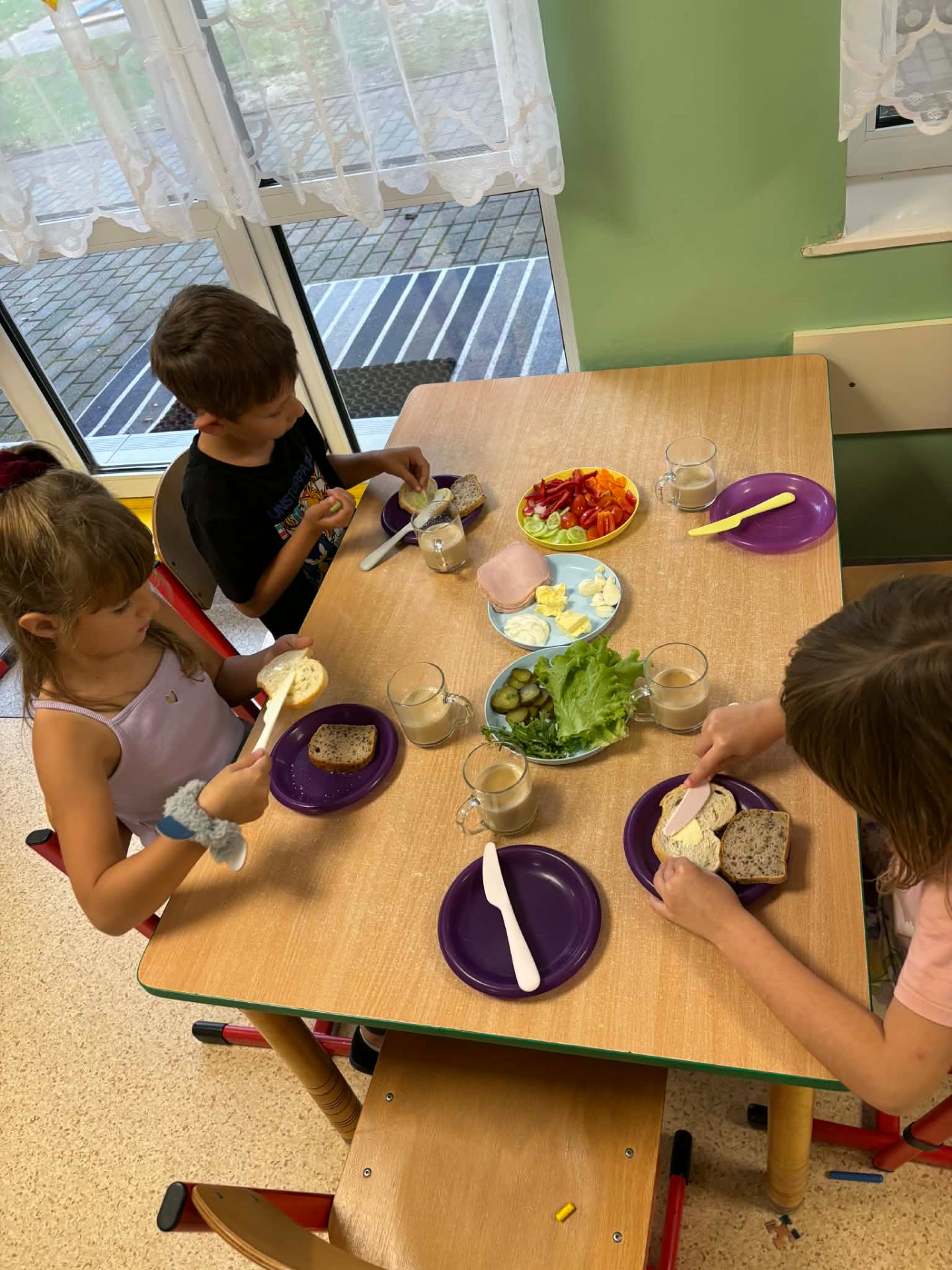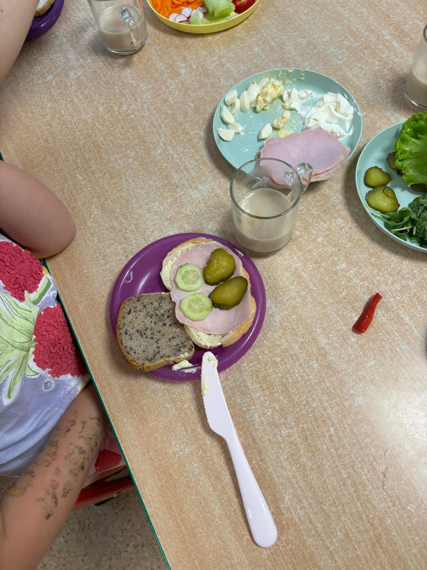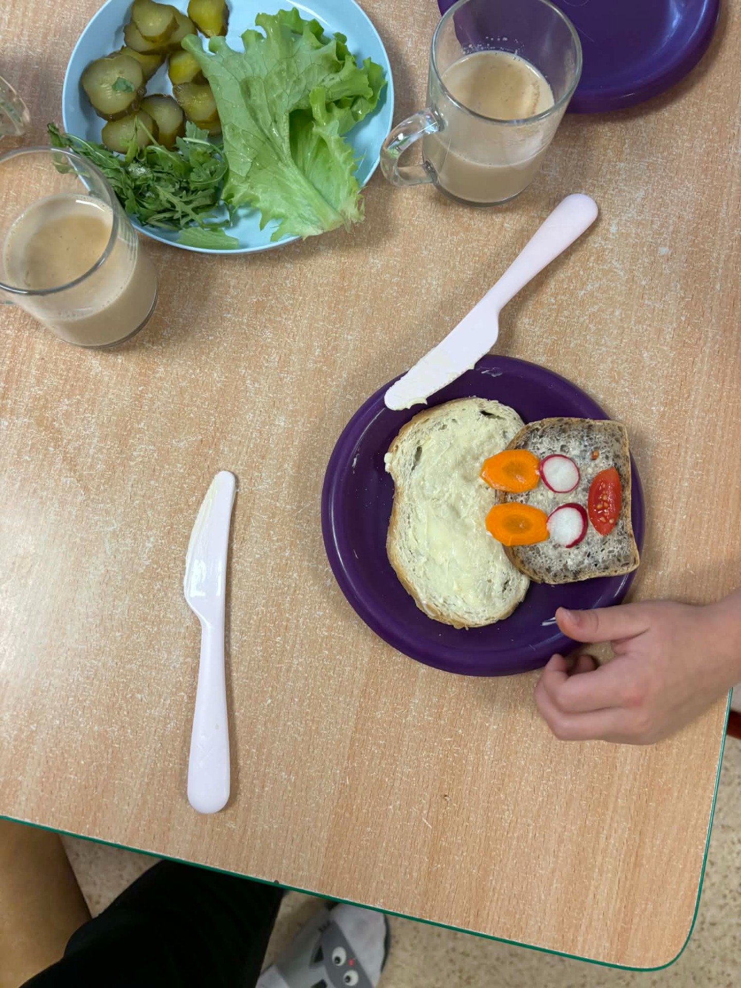 Dzieci z grupy Motyli przygotowywały własne, kolorowe kanapki. Samodzielnie wybierały składniki, uczyły się bezpiecznego korzystania z narzędzi kuchennych oraz rozwijały swoje umiejętności kulinarne. Była to doskonała okazja do ćwiczenia samodzielności, kreatywności i współpracy, a efektem były pyszne, zdrowe kanapki oraz dużo radości.
